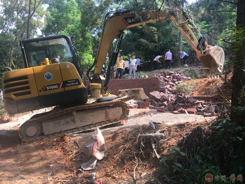 5月15日下午,石角镇冈田服务站联同石角镇民政办、城建办、国土所对圈地建墓地的围墙进行了拆除。严厉打击了顶风作案的圈地建墓地围墙的违建行为。 (石角镇冈田服务站)