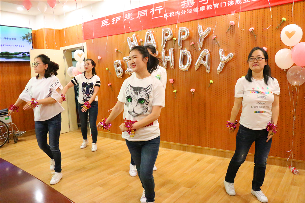 内分泌科医务人员在紧张的工作间隙精心排练了青春洋溢的开场舞c哩c哩,有精心改编的糖尿病版《卡路里》,情景剧《我的糖尿病友》,将糖尿病健康教育以生动活泼的形式奉献给患者。多年来陪伴我们成长的患者也精心排练了顺口溜《糖尿病不可怕》及控糖经验分享。现场欢声笑语、场面热烈、医护患积极参与。