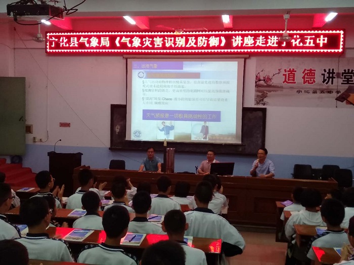 县气象局局长刘敬澄作题为《气象灾害识别及防御》的气象科普知识和防灾减灾知识讲座。他引用了大量形象直观的图片,结合宁化县实际情况,从认识气象、解读气象、运用气象、气象灾害预警信号图标说明和云图、雷达回波识别等五个方面进行了讲解,让师生们更加了解气象科普知识,增强应对突发气象灾害的能力。