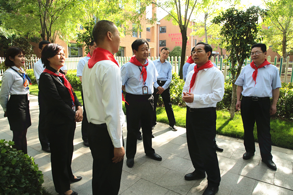 经过游泳馆时,石光亮详细询问并了解学校教学设施配备、课程开办、安全管理等情况。步行穿过林荫小道,石光亮一行来到了综合楼前,学校淑女班的同学们认真有秩序地为石光亮一行系上了鲜艳的红领巾。期间,石光亮亲切地询问孩子们的学习生活情况,并勉励她们在优越的环境中,珍惜大好时光,努力学习科学文化知识,勤思考,多锻炼,早日成长为祖国的栋梁之才。在学校图书馆,石光亮一行深入了解馆内空间布局、馆藏图书等方面的情况,并对图书馆的学习氛围给予充分肯定。随后,石光亮一行走进小学英特班的教室,孩子们正在上外教活动课。外教老师通过一首节奏欢快的英文歌,与孩子们展开了愉快的教学互动。石光亮一行被热烈的课堂气氛所感染,在认真听取了孩子们的英文介绍后,石光亮向孩子们致以节日的问候,祝福他们拥有幸福的童年、茁壮成长。最后,石光亮一行来到幼儿园,小班的孩子们在外教老师的带领下,一边唱歌一边进行动物模仿,玩得不亦乐乎。石光亮走到孩子们中间,俯下身子夸奖孩子们活泼可爱,并嘱托教师们要用更多的爱心和童心把孩子们呵护好、培养好,让每一个孩子都能在阳光下健康快乐的成长。