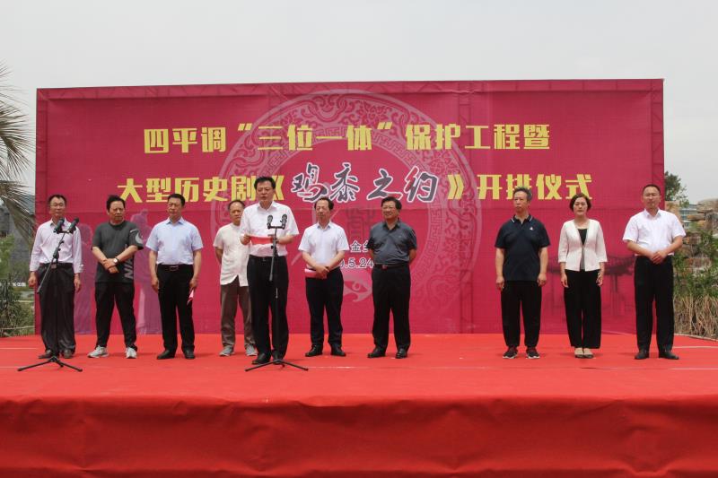 5月24日上午, 四平调“三位一体”保护项目暨金乡县大型历史剧《鸡黍之约》开排仪式在我县金龙湾文旅小镇启动。省艺术研究院院长、省戏剧创作室主任、省戏剧家协会主席张积强宣布大型历史剧《鸡黍之约》开排启动,省艺术研究院副院长张鹏举、省艺术研究院非遗所所长郭学东、省艺术研究院艺术创作委员会主任周波和市委宣传部常务副部长孙爱民应邀出席,县委副书记刘昭立致辞,县委常委、宣传部长杨凯主持开排仪式,县政协副主席、县文化和旅游局长储艳丽等出席。