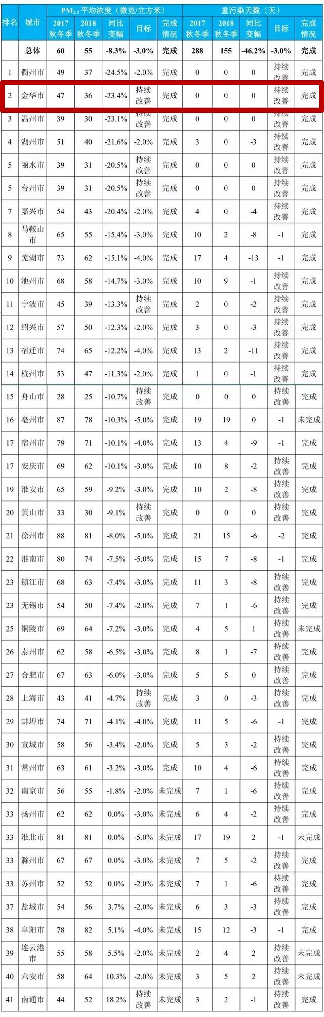 从改善幅度看,长三角地区41个城市中31个城市完成《攻坚方案》PM2.5浓度改善目标;32个城市PM2.5平均浓度同比下降,其中降幅最大的3个城市依次为衢州、金华和温州,同比分别下降24.5%、23.4%和23.1%。