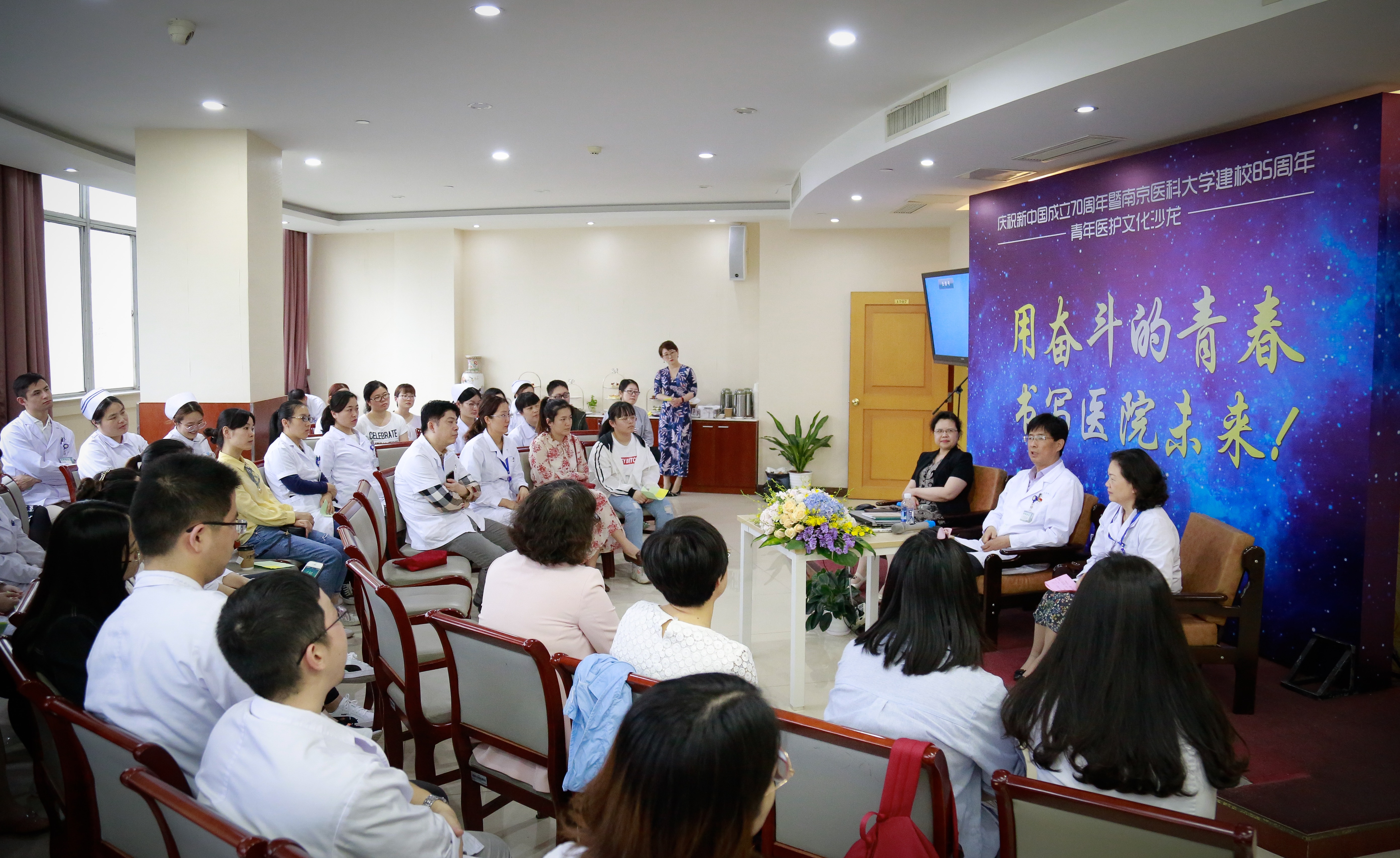 5月15日,第三届青年医护文化沙龙在我校附属老年医院举行,附属老年医院党委书记、副院长何一然,副院长刘世晴、熊亚晴、医务部主任杨俊、护理部主任莫永珍、相关职能科室负责人、60余名青年职工参加活动。党办副主任徐敏主持活动。