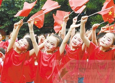 昨天,幼儿园小朋友挥舞国旗,表演合唱《祖国的花朵》。