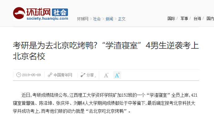 《环球网》:考研是为去北京吃烤鸭?“学渣寝室”4男生逆袭考上北京名校