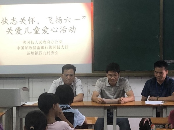 活动中,佛冈县人民政府办公室廖楚雄副主任与四九村村委主任黄灼东带来帮扶单位佛冈县人民政府办公室和邮政储蓄银行佛冈支行给小朋友们准备的六一礼物。