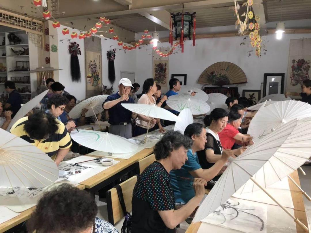 体验馆坐落在高碑店古家具一条街,古香古色韵味十足。走进馆内年画、剪纸、娟人、雕塑等各种民间艺术品琳琅满目,大家不仅参观了精美的作品,还动手体验制作油纸伞。据馆长介绍,油纸伞的制作需要很强的工艺技巧,并非短时间可以掌握,所以本次主要让大家体验一下画伞面的艺术。