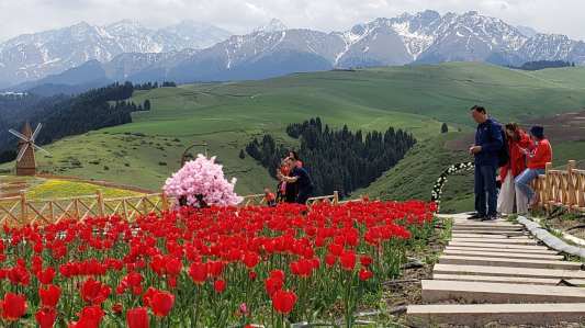 中国昌吉网讯(通讯员高丽娟)近日,在国家4A级景区江布拉克景区内,200万株多彩多姿的郁金香在天山雪峰下竞相绽放,来自全国各地的游客络绎不绝,前来观赏这一美景。