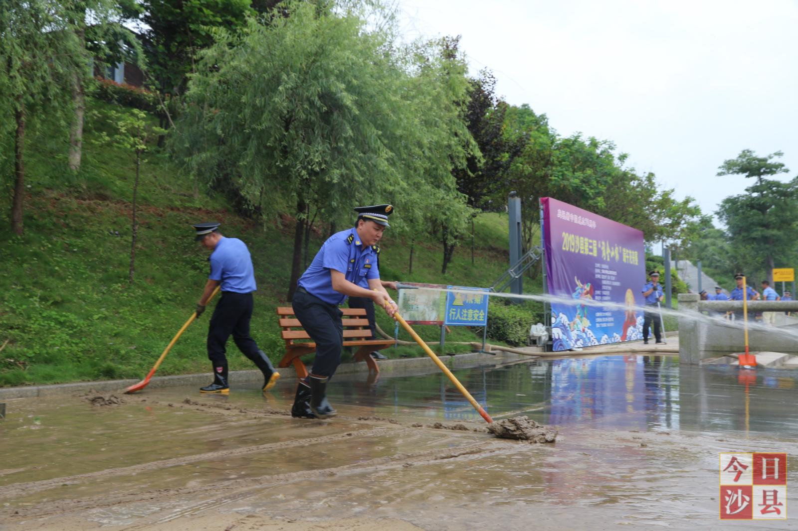 他们有的拿着铁铲清理道路上的淤泥,有的徒手捡起沉积在植被上垃圾杂物,有的扛起高压水枪对着步道淤泥不断冲洗,大家卯足干劲,不怕脏、不嫌累,干得是热火朝天。