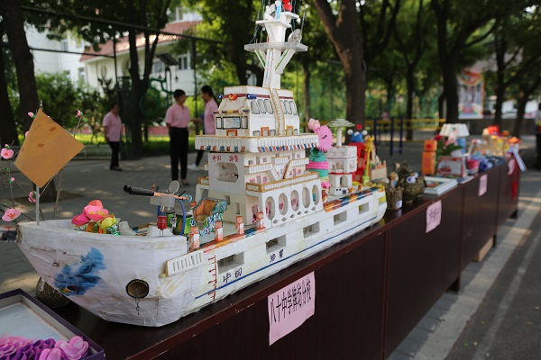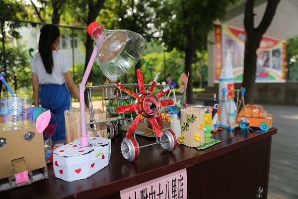 “您看,同学们用废弃的易拉罐、装薯片的桶和螺丝钉、纸板做成了一架飞机模型,这是男孩子们最喜欢的玩具!”在工大附中十八里店分校操场上,小讲解员向参观领导介绍起了学生们利用废弃物品制作的展品。记者在现场看到,在林林总总近百种展品中,有来自首都师范大学附属朝阳实验小学的同学们用塑料瓶和吸管制成的鱼缸充氧器;有北京市第八十中学牌坊分校的学生们利用泡沫块、彩纸制作的“中国海警号”航模;还有用塑料和布条制作的拖鞋,用瓶盖和纸板做成的钟表……各类废弃物通过孩子们的创意改造,形成了一个个美观、实用的小物件。