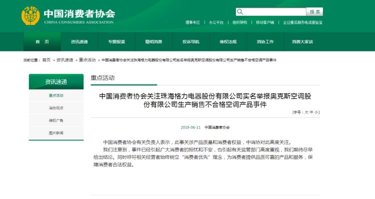 中消协:对格力实名举报奥克斯空调一事高度关注
