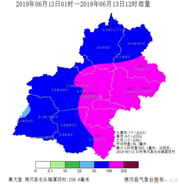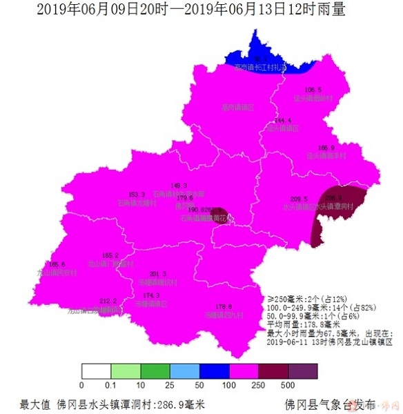 受高空槽和低涡切变共同影响,6月9日夜间至13日上午我县出现持续性强降水过程。9日20时至13日12时,全县平均累积雨量178.8毫米,水头潭洞录得过程最大雨量286.9毫米。其中6月13日1时到12时,平均雨量98.7毫米,水头潭洞录得最大雨量226.6毫米。