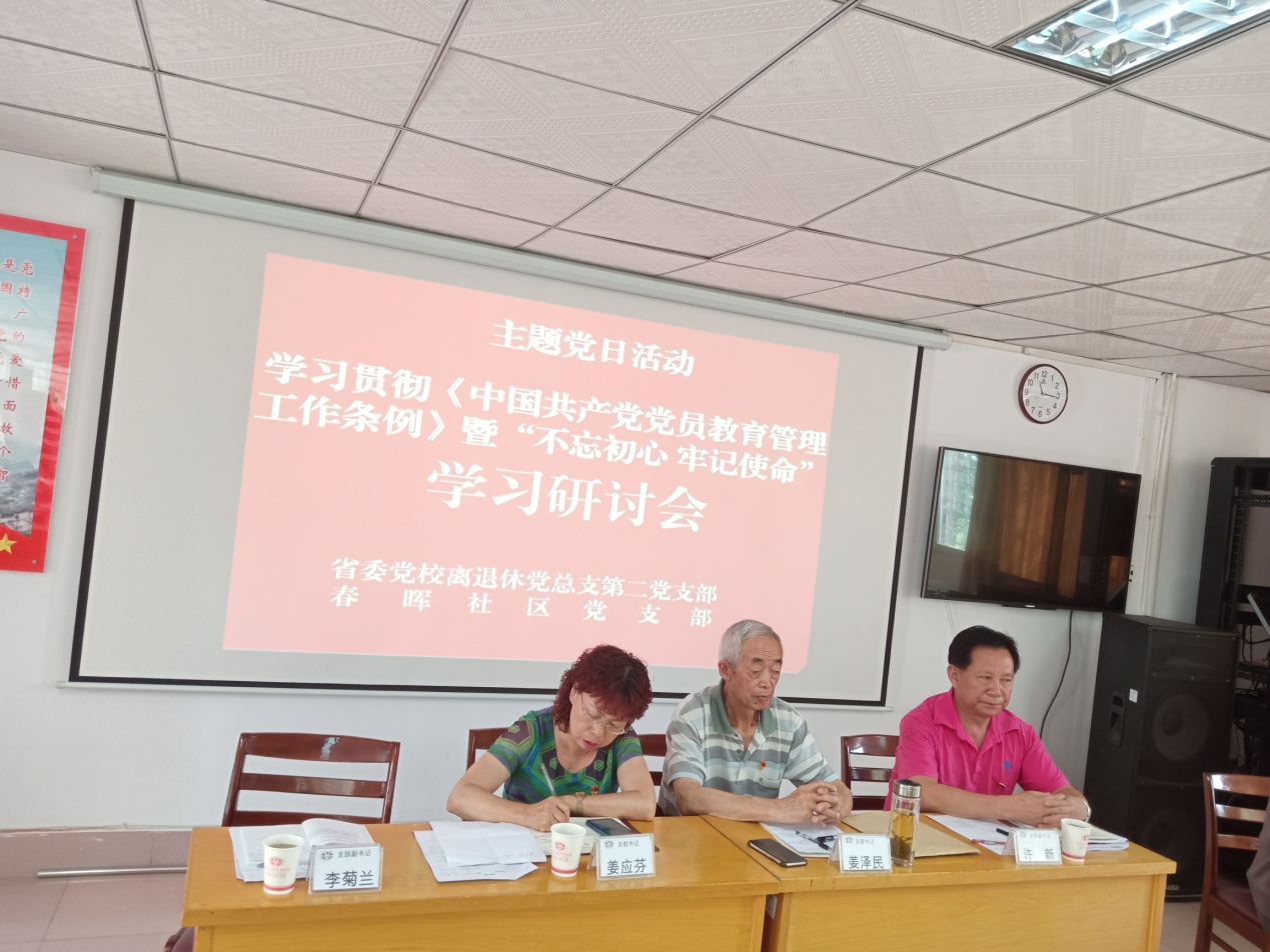 上午的课程一是严格落实戴徽章、唱国歌、重温入党誓词、晨读党章“四个一”活动要求,加强教育培训“仪式感”,进一步唤醒党员身份意识和宗旨意识;二是社区党支部书记姜应芬作了开班动员讲话,要求全体参学的党员要严格按照党组织的课程安排,参加连续3天的培训活动,要遵守上课纪律、认真听课、记录学习笔记,真正做到学以致用;三是邀请到了云南省委党校离退休第二党支部书记姜泽民讲授《中国共产党党员教育管理条例》;四是开展“不忘初心 牢记使命”学习研讨会,由省委党校离退休的6名教授分享“不忘初心 牢记使命”学习心得和体会,让学员们深受启发:不忘初心是责任和担当,要时刻牢记作为党员的责任和使命;要不断地追求进步,向往光明,在党的领导下,在学习和实践中不断锤炼自己。