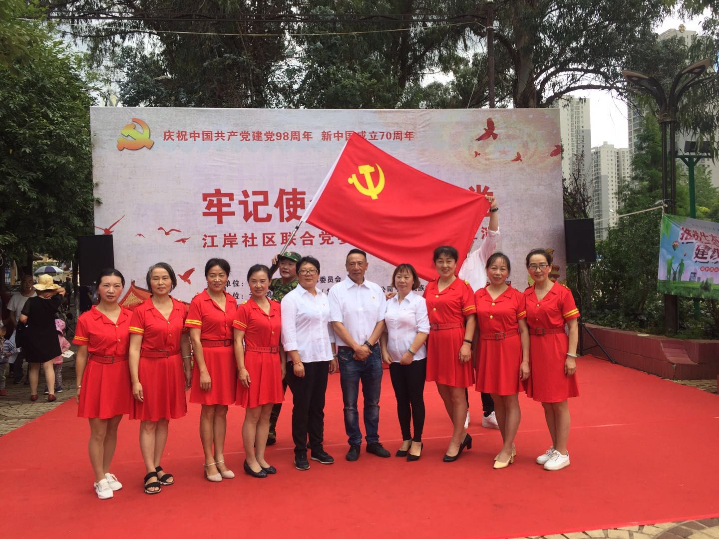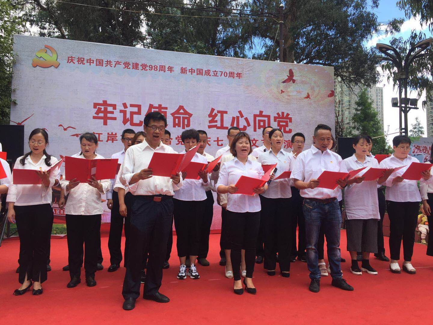 为庆祝建党98岁周年,丰富辖区居民文化生活,2019年6月20日,莲华街道办事处江岸社区联合党委与共建单位在江岸小区沿江广场举办了“不忘初心·红心向党”庆七一文艺汇演。200余名居民群众和演职人员欢聚一堂,共同庆祝伟大的中国共产党建党98周年华诞。