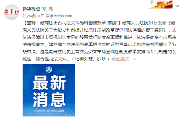 ? 据新华视点微博6月21日消息,最高人民法院21日发布《最高人民法院关于为设立科创板并试点注册制改革提供司法保障的若干意见》,从依法保障以市场机制为主导的股票发行制度改革顺利推进、依法提高资本市场违法违规成本、建立健全与注册制改革相适应的证券民事诉讼制度等方面提出了17条举措。这是最高法历史上首次为资本市场基础性制度改革安排而专门制定的系统性、综合性司法文件。
