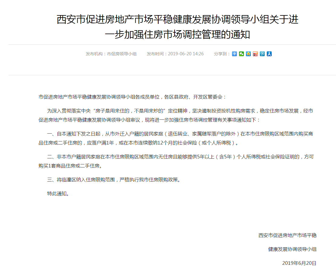 据西安市住房保障和房屋管理局官网6月20日消息,西安市促房领导小组20日发布《西安市促进房地产市场平稳健康发展协调领导小组关于进一步加强住房市场调控管理的通知》。通知提出,自本通知下发之日起,非西安市户籍居民家庭在本市住房限购区域范围内无住房且能够提供5年以上(含5年)个人所得税或社会保险证明的,方可购买1套商品住房或二手住房。