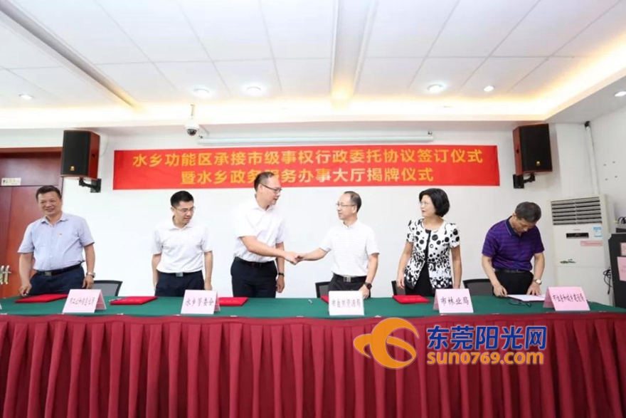 东莞阳光网7月1日讯 7月1日上午,水乡功能区承接市级事权行政委托协议签订仪式暨水乡政务服务办事大厅揭牌仪式举行。其中,市自然资源局99项市级事权下放水乡功能区,中堂、望牛墩等5镇的群众可就近办理相关业务。