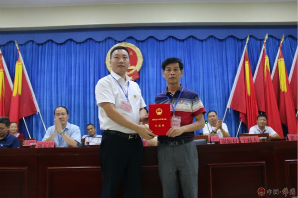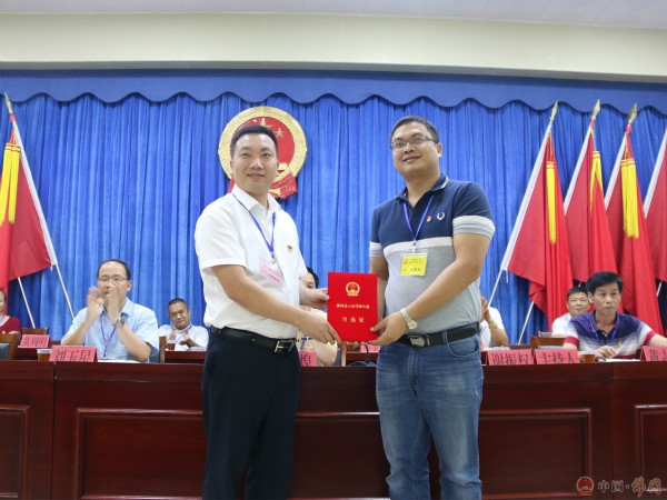 (汤塘镇委书记谢振权为新当选镇人大主席黄志清颁发当选证)