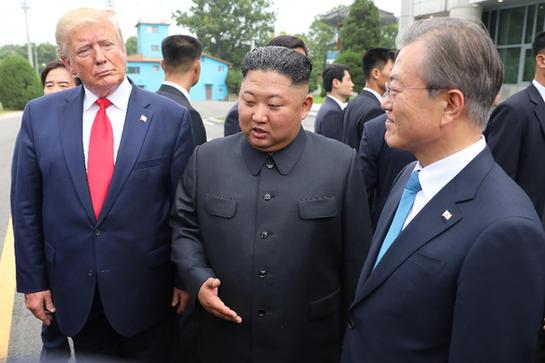 6月30日,在板门店韩方一侧,朝鲜最高领导人金正恩(中)、美国总统特朗普(左)和韩国总统文在寅共同会面。