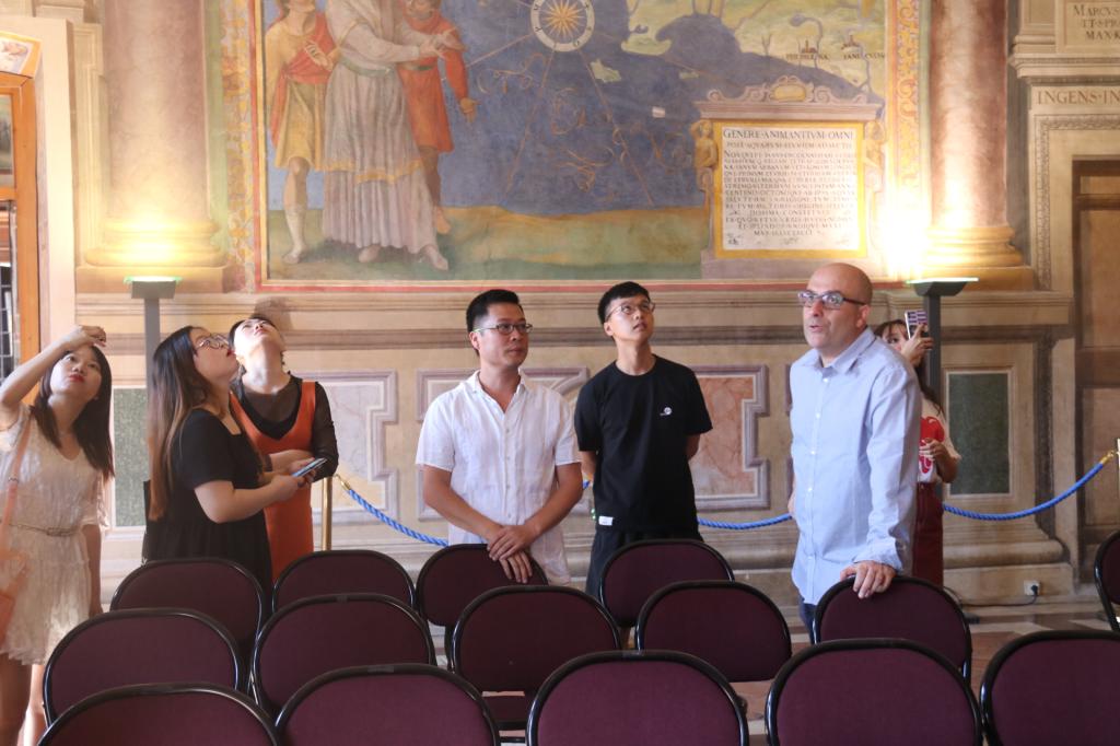 会前,在Luigi Sepiacci和Antonio Rocca的带领下,我校学生参观了市政厅。Antonio Rocca向大家介绍了维泰博市政概况、市政厅内部壁画历史及内涵、市政厅室内环境设计、装潢设计理念等。