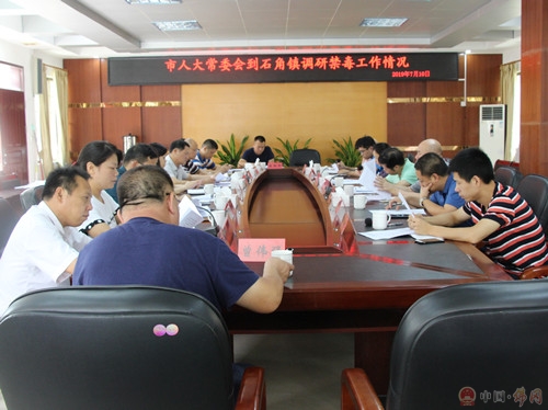 调研组首先在石角镇召开了座谈会,会上石角镇分管扶贫、禁毒和农村生活垃圾管理的领导分别汇报了工作开展的情况,调研组就各项工作的开展和实施情况与石角镇参会人员进行了交流。会后,调研组一行先后到镇社区戒毒中心、里水村和镇人大代表联络室实地调研并在里水村向村民发放了禁毒宣传资料。在查看镇人大联络室建设和工作开展情况后对联络室工作给予了高度评价。