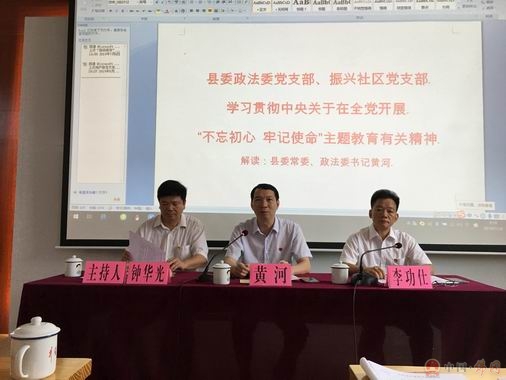 随后由县委常委、政法委书记黄河同志给大家传达学习5月13日中央政治局会议关于在全党开展“不忘初心、牢记使命”主题教育有关精神。黄河强调:中国共产党人的初心和使命,就是为中国人民谋幸福,为中华民族谋复兴。这个初心和使命是激励中国共产党人不断前进的根本动力。