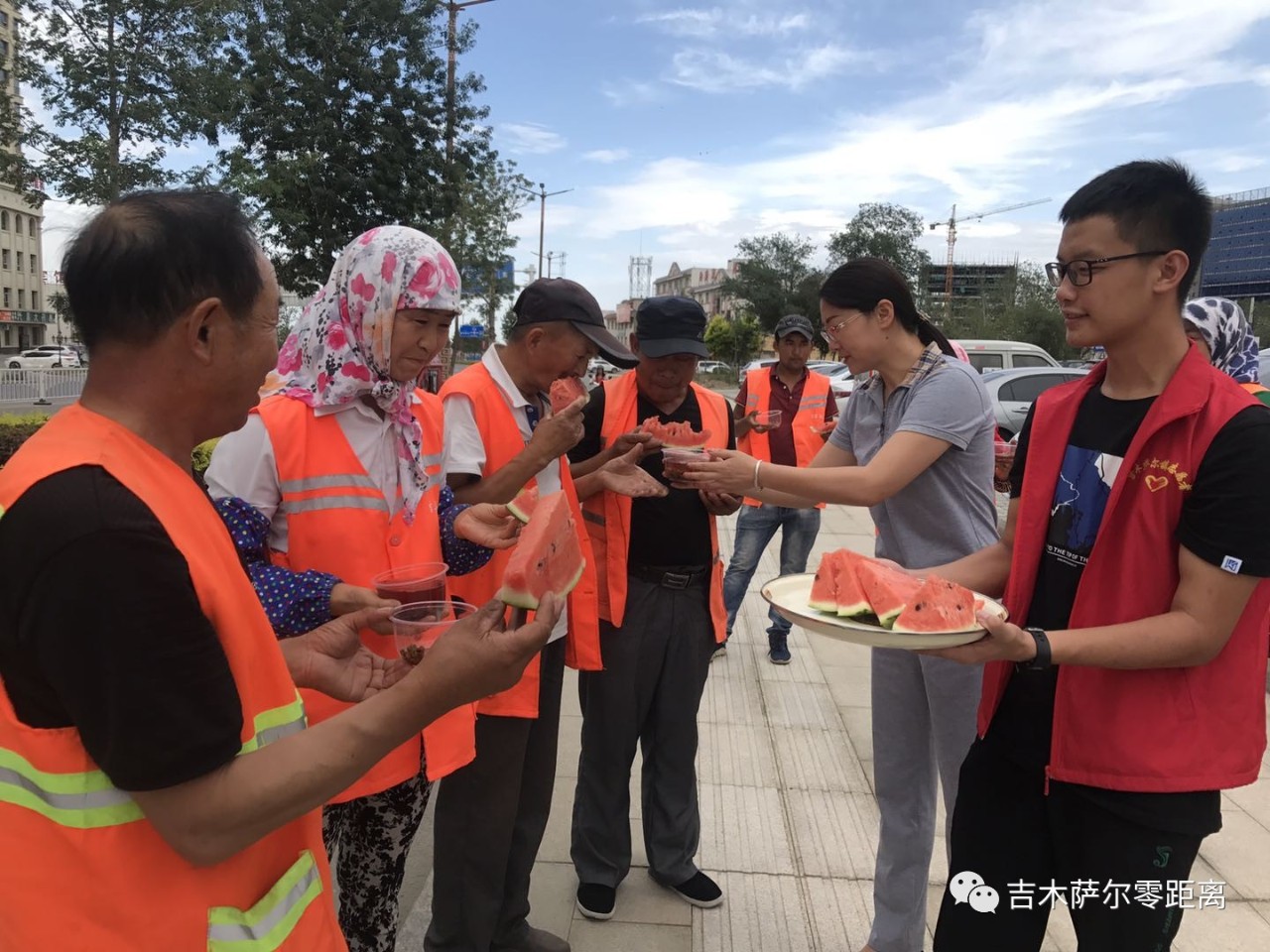 “阿姨,歇会儿吃块西瓜吧。”“阿姨辛苦了,这是给您的清凉油。”在“送清凉”活动中,北庭路社区辖区内的返乡大学生志愿者蔡嵘特别热情,她将一块块切好的西瓜和一盒盒清凉油递到环卫工人手中。她说,城市的整洁全靠环卫工人,参加活动就是向他们表达敬意,同时让他们知道,这个县城中许多人都在关心他们。