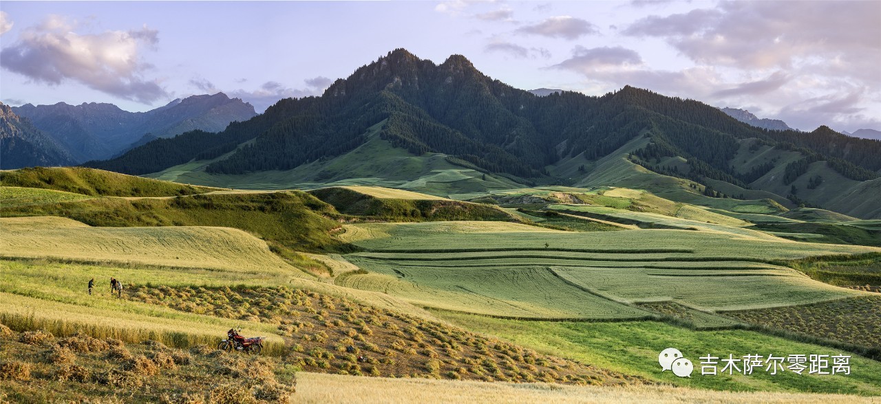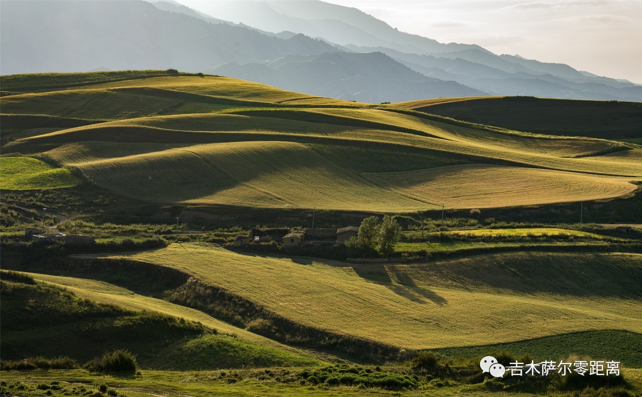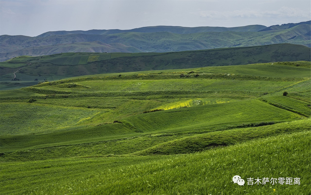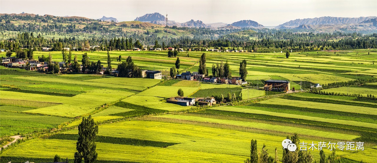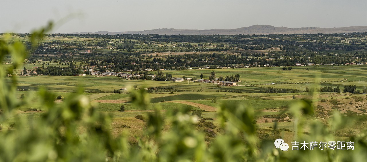 这是一个山间盆地,好似聚拢了天山精华而造化出了不凡的胜景。站在山顶往下看,一张黄、绿、红、蓝相间的大画板无限延伸。从东往西,曹家山千亩旱田景区,中部平原喷灌区,西部林果间作区依次摆开。