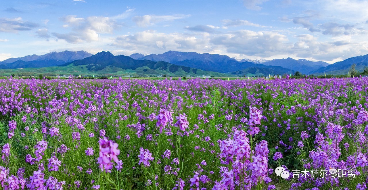曹家山展现的是一派金色的麦浪景象,在起起伏伏的山梁上,成片的麦田一望无际,绵延不断,微风吹过,波浪滚滚,金光闪闪,身临其中,仿佛驾舟破浪前行,又仿佛来到了另一个奇台江布拉克,木垒平顶山。中部平原区则是以这个大画板最精彩微缩的部分:黄的油菜花、白的土豆花、蓝色的紫苜蓿花,红色的红花,一块块,一条条,像学生的调色画板整齐排开,又似仙女彩带飘洒人间。而在画板的核心部位,是黄朝花海基地,大块的鲁冰花、冰岛虞美人、蓝香芥、富贵豆等花种鲜艳怒放,引来无数游人观看,拍照,歌声阵阵,笑声隐隐,一起传向巍峨的天山雪峰。