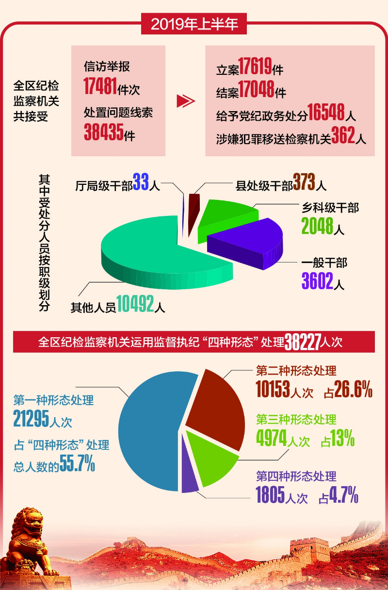 2019年上半年,新疆纪检监察机关共接受信访举报17481件次,处置问题线索38435件。立案17619件,结案17048件,给予党纪政务处分16548人,涉嫌犯罪移送检察机关362人。其中受处分人员按职级划分:厅局级干部33人,县处级干部373人,乡科级干部2048人,一般干部3602人,其他人员10492人。