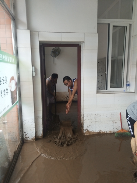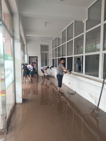 8月3日上午8:00,邹晗校长组织幸福中学领导班子成员及伙食团员工积极开展灾后自救。9:00左右教育局刘兵同志到幸福中学查看灾情,邹晗校长向刘兵同志汇报了受灾具体情况:洪水退去后,幸福中学损失严重,伙食团、门卫室等多处进水,整个操场淤泥近10厘米厚。