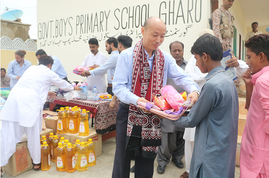 8月1日上午,由甘肃能源巴基斯坦分公司8名中巴员工组成的志愿者团队在分公司总经理梁百华的带领下,带着一批捐赠物资来到格罗小学,看望慰问师生,并参加了校舍修缮移交仪式和互动活动。活动中,格罗小学师生和当地居民为志愿者们一一献上了一种名叫“阿吉拉可”类似藏族哈达的布质花巾,表达了对中国朋友的欢迎、感谢以及美好的祝愿。