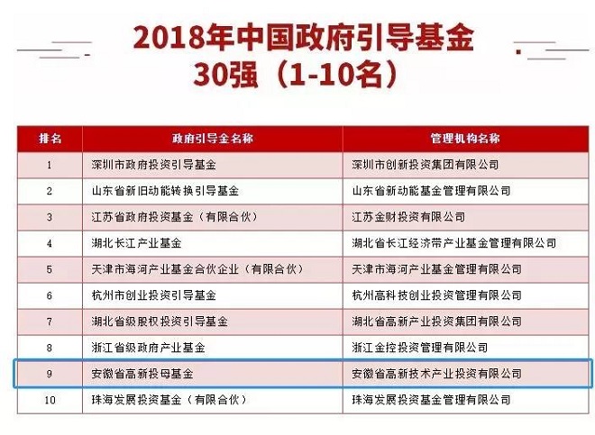 安徽省高新投母基金获清科中国政府引导基金排名第九名