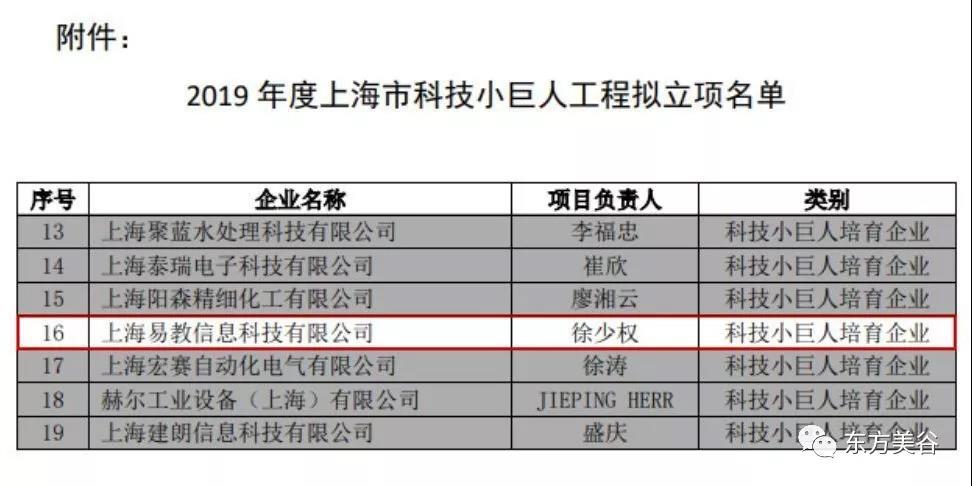 上海市科委对2019年度上海市科技小巨人工程拟立项名单进行了公示。经公开自主申报和严格专家评审以及近一年的激烈角逐,坐落于临港南桥科技城的上海易教信息科技有限公司(简称“上海易教”)凭借自身实力,荣登上海市科技小巨人培育企业。公司获此殊荣,代表了上海市政府及相关部门对上海易教在技术创新、人才储备、企业运营管理等多方面工作的认可。