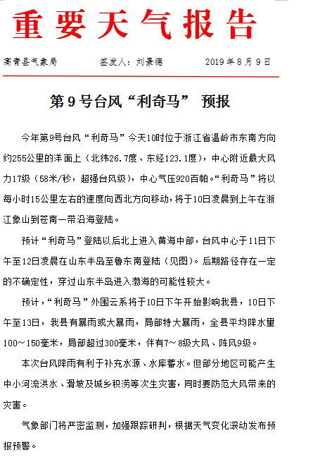 预计,“利奇马”外围云系将于10日下午开始影响我县,10日下午至13日,我县有暴雨或大暴雨,局部特大暴雨,全县平均降水量100~150毫米,局部超过300毫米,伴有7~8级大风、阵风9级。