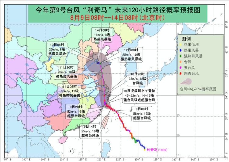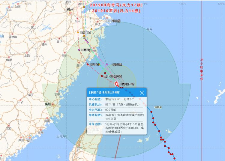 今年第9号台风“利奇马”今天10时位于浙江省温岭市东南方向约255公里的洋面上(北纬26.7度、东经123.1度),中心附近最大风力17级(58米/秒,超强台风级),中心气压920百帕。“利奇马”将以每小时15公里左右的速度向西北方向移动,将于10日凌晨到上午在浙江象山到苍南一带沿海登陆。