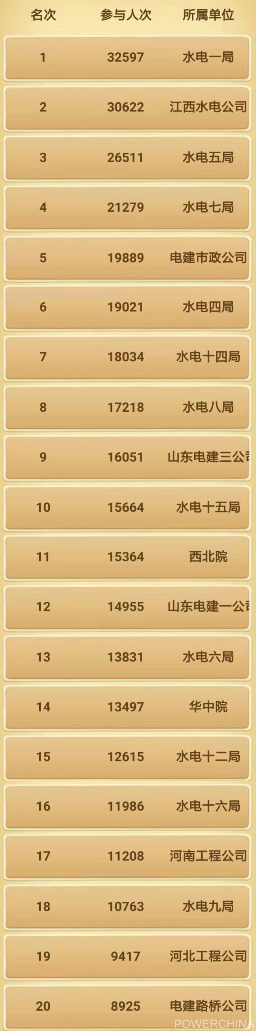 此次答题活动得到了公司总部和基层党组织和广大党员干部职工、离退休老同志积极响应,10天里共有8.32万人参加了答题活动,点击数则突破621万人次。前20名的单位有:水电一局、江西水电公司、水电五局、水电七局、电建市政公司、水电四局、水电十四局、水电八局、山东电建三公司、水电十五局、西北院、山东电建一公司、水电六局、华中院、水电十二局、水电十六局、河南工程公司、水电九局、河北工程公司、电建路桥公司。其中,18家单位组织答题超过1万人次,其中水电一局、江西水电公司答题超过3万人次,水电五局、水电七局答题超过2万人次。电建路桥公司、电建市政公司、水电九局、华中院、电建港航公司、贵阳院等单位组织干部职工全员参与了答题。