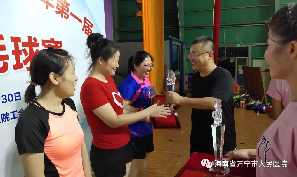 万宁市人民医院羽毛球协会领队吴勇为获奖运动员颁奖