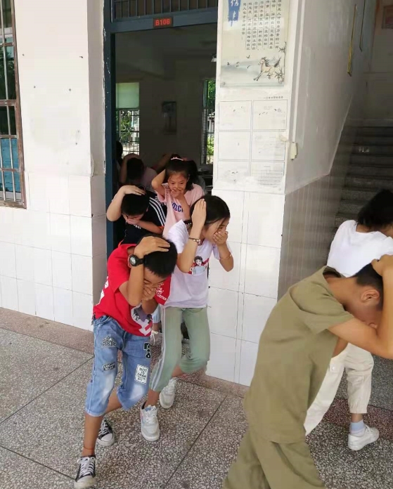 随着一声响彻校园的警报鸣笛,各班老师立即组织本班学生双手抱头,弯着腰,猫着步,快速地沿着学校指定的疏散通道撤离。各楼梯口把守的老师不时叮嘱同学们注意安全,不要推搡,指引学生到达安全地点,随即各班清点人数,全校400多名师生全部安全疏散,整个逃生过程仅花了一分二十三秒,快速而有序。