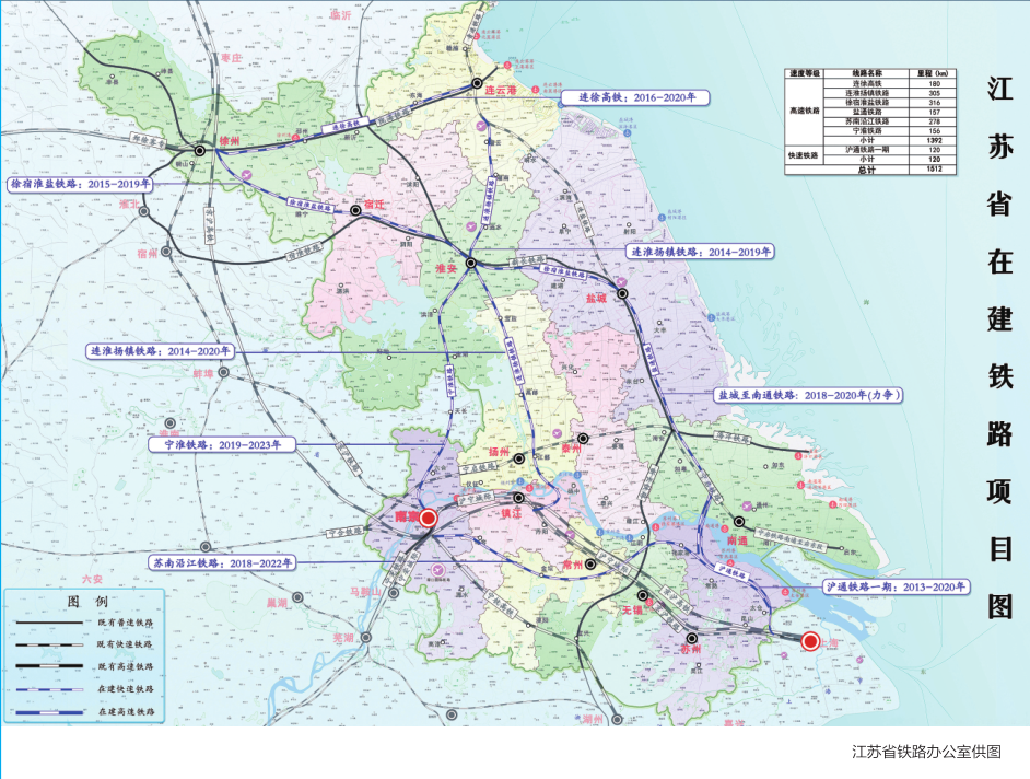 连淮扬镇铁路重大控制性工程五峰山长江大桥正在加快建设,2020年全线通车。连徐铁路设计时速为350公里,预计2020年底建成。盐通铁路设计时速350公里,力争2020年底提前建成。沪通铁路一期北起宁启铁路南通站,接入沪宁铁路安亭站,设计时速为200公里,预计2020年建成。