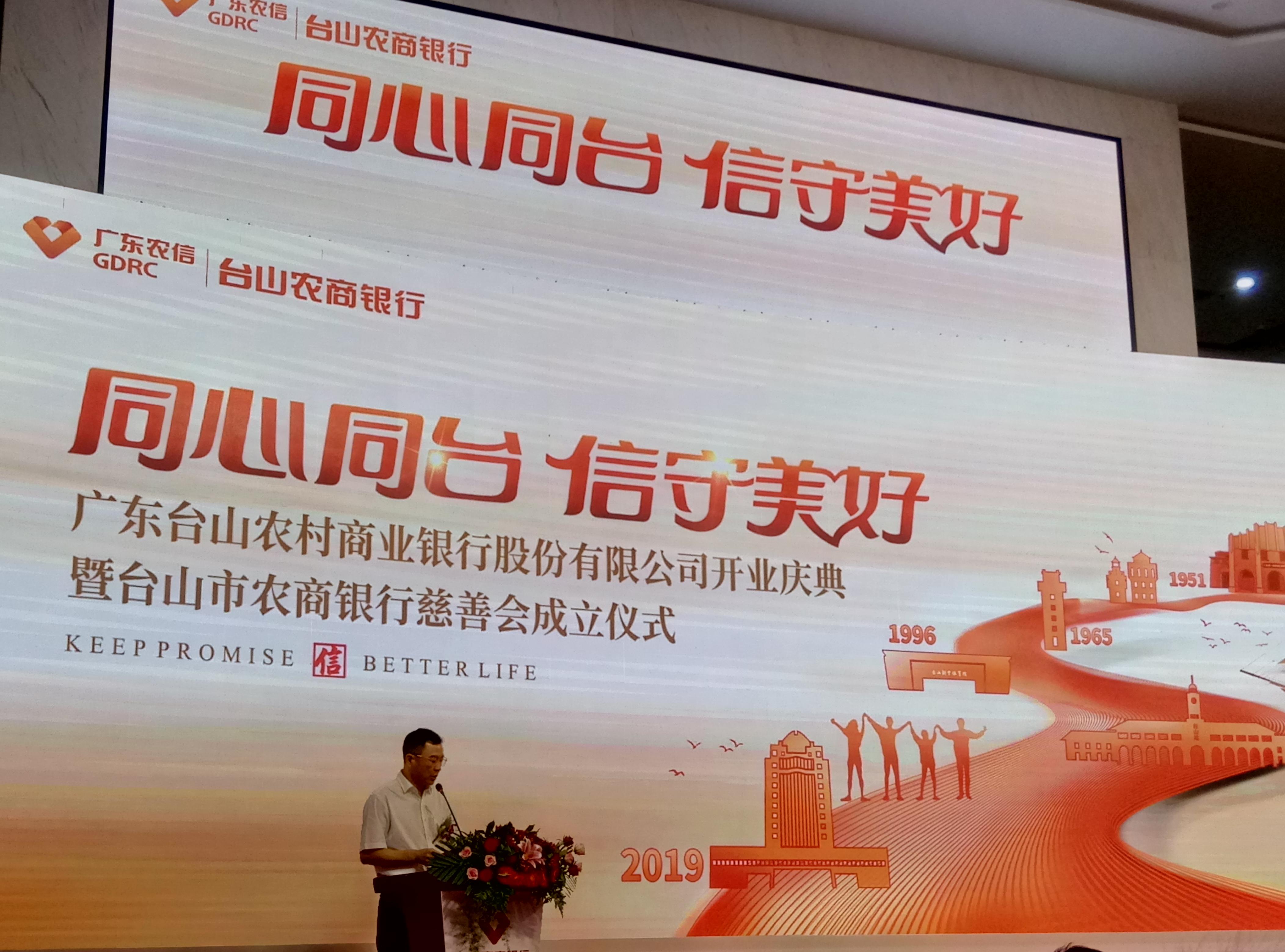 9月29日,在祖国70华诞之际,台山农商行举行了隆重的开业仪式,现场邀请了省联社、江门市、台山市各级领导及社会人士参与,现场气氛热烈。在开业仪式上,江门市副市长蔡德威进行了致辞,强调了金融对于实体经济的重要性,并对台山农商行寄予了厚望,希望台山农商行开业后继续服务三农及中小微企业,解本地企业融资之急,发挥台山金融机构“主力军”的作用,做好台山人“家门口”的金融机构。随后,省联社、江门市政府、江门银保监分局、台山市政府等领导共同推动拉杆,台山农商行“同心同台 信守美好”的行训缓缓在舞台出现,标志着台山农商行正式开启新的征程。