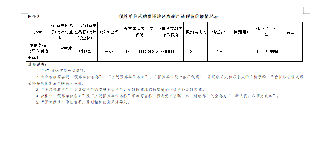 为提高工作效率,各市(区)县财政部门不通过纸质文件报送本级预算单位预留采购份额比例等情况,统一通过“采购人管理系统”下载填报“预算单位采购贫困地区农副产品预留份额情况表”,信息填报工作于10月底前完成。