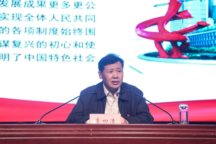 李四清指出,当下我们幸福安定的生活,来源于我们有一个强大的政党,一个强大的国家,正是因为中国共产党始终坚持不忘初心、牢记使命,才有现在国家的繁荣富强和稳定和平。他从理论维度、历史维度、实践维度和当前实际工作维度四个维度,深刻解读了中国共产党的初心和使命就是为中国人民谋幸福、为中华民族谋复兴。