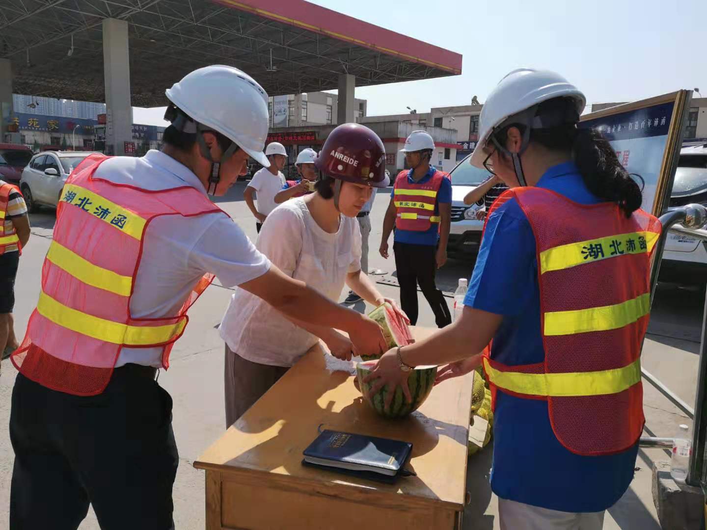 慰问组一行给工人们送上西瓜、清凉礼包等防暑降温物资,向冒着高温辛勤工作的工人们表示敬意和慰问。