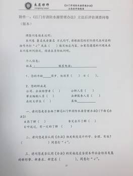 江门市消防水源管理办法》(以下简称《办法》)于2017年5月1日实施,是我市拥有立法权后颁布的第二部政府规章。为全面了解掌握该《办法》的实施情况,进一步加强我市消防水源管理工作,市司法局联合市消防支队成立评估工作小组,组织开展《办法》立法后评估。本次评估工作由市消防支队委托第三方评估机构广东良匠律师事务所具体实施。