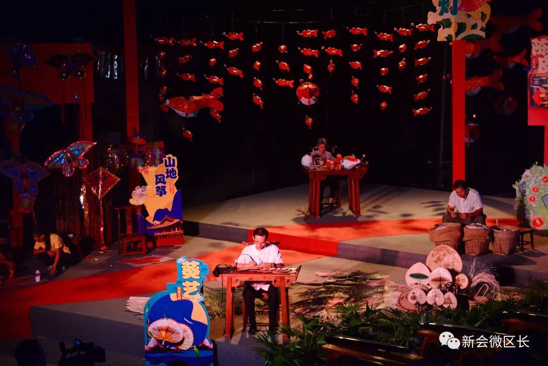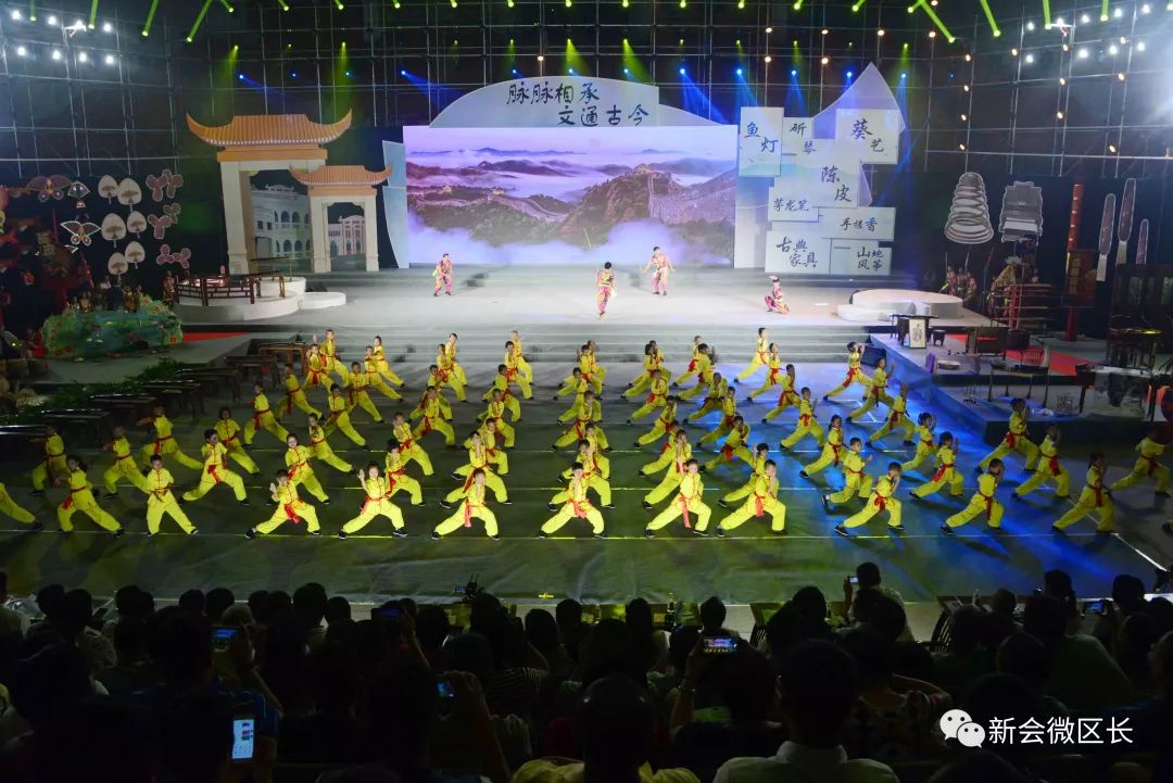 当晚,开幕式文艺演出以新会非遗为表演元素,以文艺的形式彰显葵乡文化特色,通过非遗传承情景表现、非遗舞蹈杂技、古琴演奏方阵、蔡李佛拳方阵,加以穿越古今的人物对白,将新会的文化传承与冈州历史文化名人对国家、对家乡的情感呈现于舞台之上,从而打造和宣传葵乡文化品牌,弘扬我区的历史传统文化。