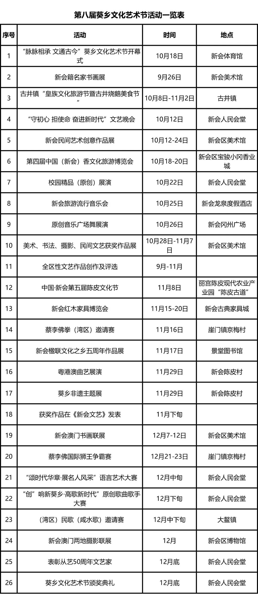 本届葵乡文化艺术节由开幕式、红色经典、湾区扬帆、葵乡新韵、产业风采、闭幕式六部分组成。从2019年9月下旬至12月下旬,整个文化艺术节持续时间长达三个月,文化艺术节将“奋斗新时代,筑梦新葵乡”这一主题将贯穿于六大板块、26项群众文化活动中,内容涵盖音乐、舞蹈、书画、诗词、楹联、语言艺术、摄影、体育、非遗等多个领域;通过举办10个艺术展览、7场文艺演出、5项文艺赛事、4大文化节庆,描绘幸福葵乡、美丽新会,弘扬新会历史传统文化,热情讴歌我区改革开放以来经济社会发展取得的辉煌成就以及新时代葵乡人民砥砺前行、积极投身粤港澳大湾区建设的奋斗精神。其中,12项文化艺术节活动融合“文化+旅游”“文化+体育”“文化+产业”特色,更有9项活动面向粤港澳大湾区。其规模之大、场次之多、内容之丰富为历届之最。