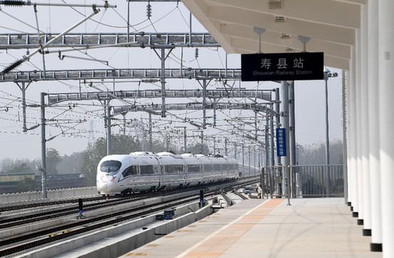 10月24日,一辆试运行列车驶出商合杭高铁寿县站。