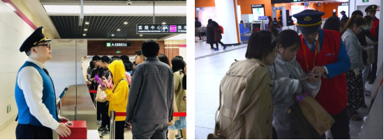? 精心组织强秩序,科学统筹保安全。客流堵塞易发生在安检区,针对此项问题,车站增设安检通道、增加安检秩序员,保证乘客有序排队,提高安检效率及通过率。两个车站从预制票制作、隔离设施摆放、乘客进出引导、客流数据上报、列车到发组织等方面,有条不紊地推进各个环节,全力保障乘客出行安全。