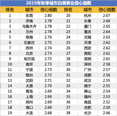 从地域上来看,在被调研38个城市的事业信心指数中,位列前五的城市为东莞、济南、乌鲁木齐、兰州、珠海,指数分别为2.80、2.78、2.78、2.78、2.76。一线城市中排名最好的是北京,位列第8,其次为位列第16的上海,深圳与广州分别排名第29与第30。当然,这也与各城市等级的就业景气度密切相关。